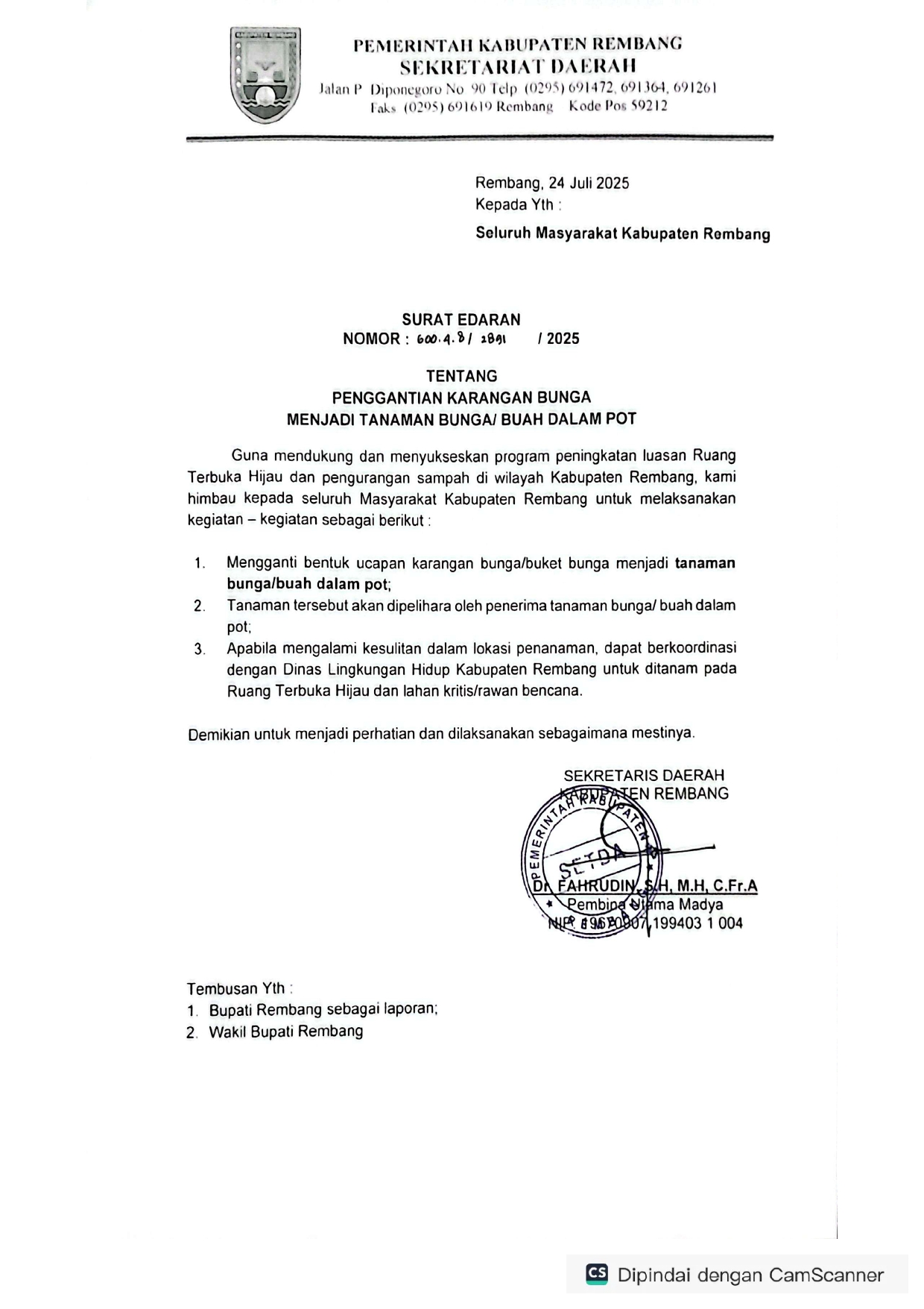Pemerintah Kabupaten Rembang (Pemkab Rembang) melarang penggunaan karangan bunga sebagai ucapan selamat atau peringatan hari besar bagi seluruh lapisan masyarakat. Sebagai pengganti masyarakat diminta untuk membawa tanaman buah atau hiasan bunga sebagai tanda ucapan.